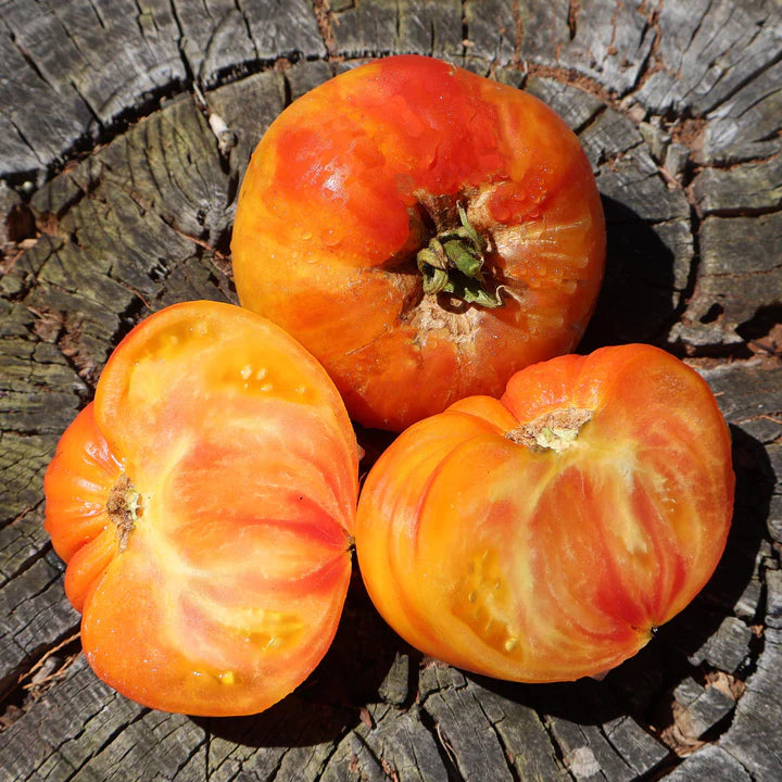 Don’t let the plain name fool you—this striking beefsteak tomato is anything but ordinary. With its golden-yellow base and bold red stripes, German Yellow Stripe is a feast for the eyes and the taste buds. The fruits are large, juicy yet meaty, and deliver a flavour that balances natural sweetness with rich depth.